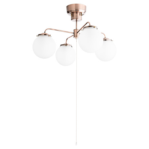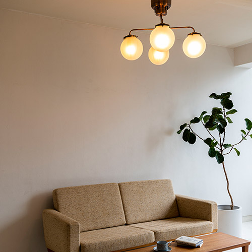 球状の乳白色のガラスがほわんっと柔らかく光る様子は癒やしの空間へと導いてくれます。特徴的なアンティークコッパーの色味は全体フレームを華奢にすることで上品な仕上がりとなっています。