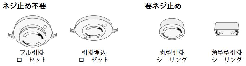 ※丸型、角型シーリングの天井に取り付ける場合、天井へのネジ止めが必要です。(下図参照)