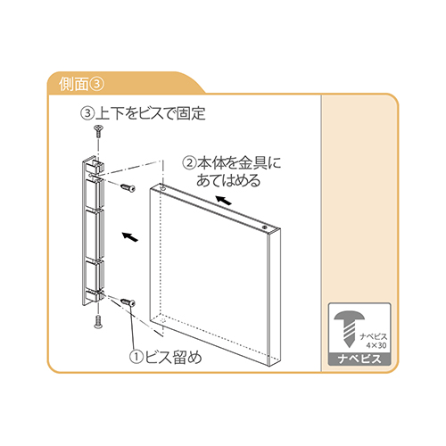 | 取付方法 | ![]() プレート交換式 ■表示面の取り付け方 表示面を下部の樹脂バネに密着させながら取り付けてください。 ※取付ネジ(ナベビス・サラビス)は付属しておりません。 ※取り付ける壁面により取付方法が異なる場合がございます。 |
