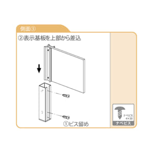 | 取付方法 | ![]() プレート交換式 ■表示面の取り付け方 表示面を下部の樹脂バネに密着させながら取り付けてください。 ※取付ネジ(ナベビス・サラビス)は付属しておりません。 ※取り付ける壁面により取付方法が異なる場合がございます。 |